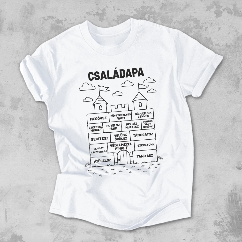 Ez a különleges férfi póló igazi tisztelgés minden elkötelezett családapa előtt. A várgrafika mély üzenetet hordoz: apa a család védelmezője, a biztos pont, akire mindig lehet számítani. A téglákba írt szavak – megvédesz, tanítasz, példát mutatsz, szeretsz – mind azt az értékrendet tükrözik, amire egy erős család épül.