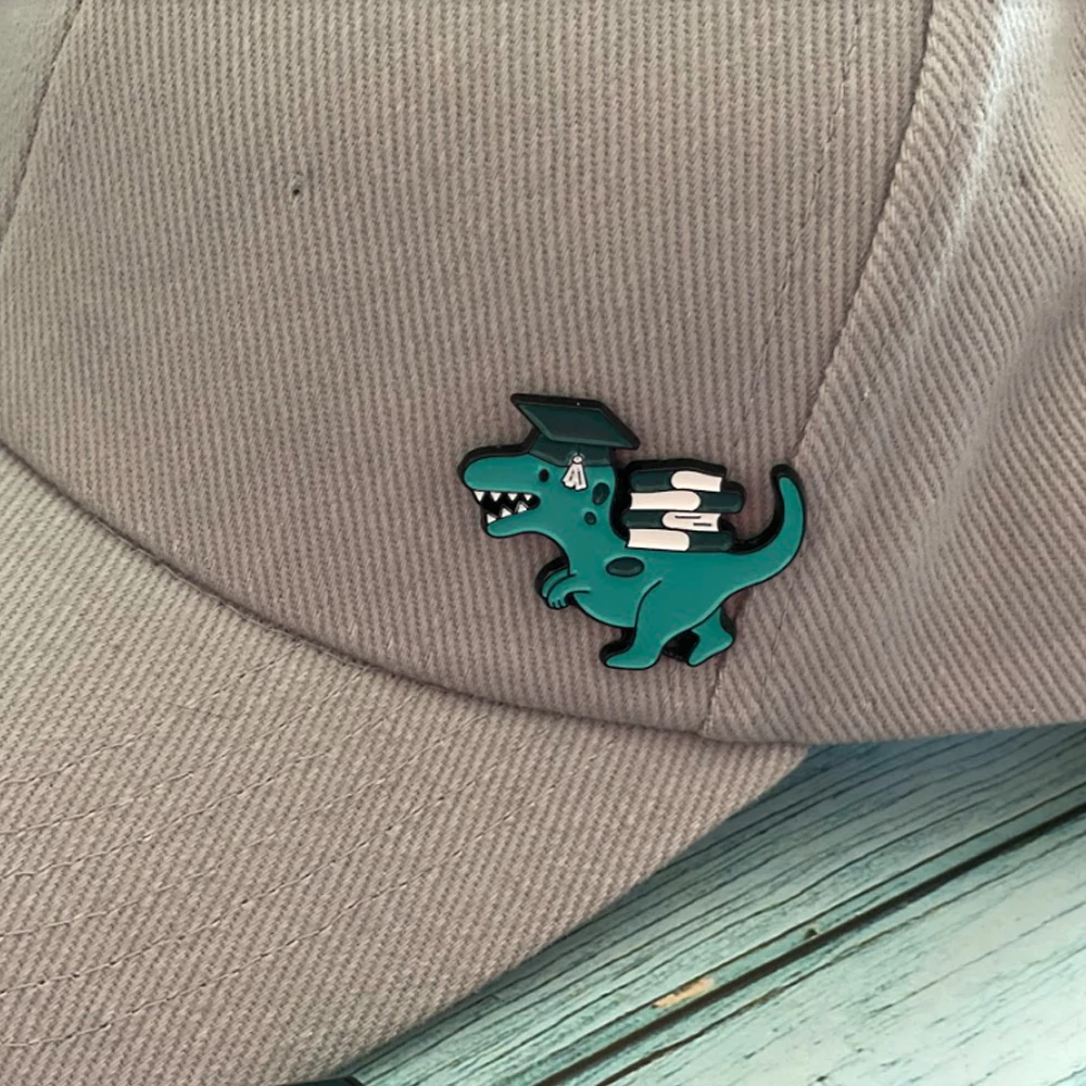 Színes és vidám fém kitűző - Dínó könyvekkel - mintával.