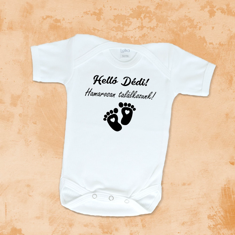 Ez a bájos babaruha a „Helló Dédi, Hamarosan Találkozunk” felirattal tökéletes módja annak, hogy bejelentsd a nagy örömhírt dédinek! Ez a babaruha biztosan könnyeket csal dédi  szemébe, és izgalommal tölti el őket az új családi kötelék várakozása közben. Egy baba érkezése a legnagyobb ajándék! Ez a babaruha tökéletes ajándék mamáéknak, hogy együtt ünnepeljétek a baba érkezését!