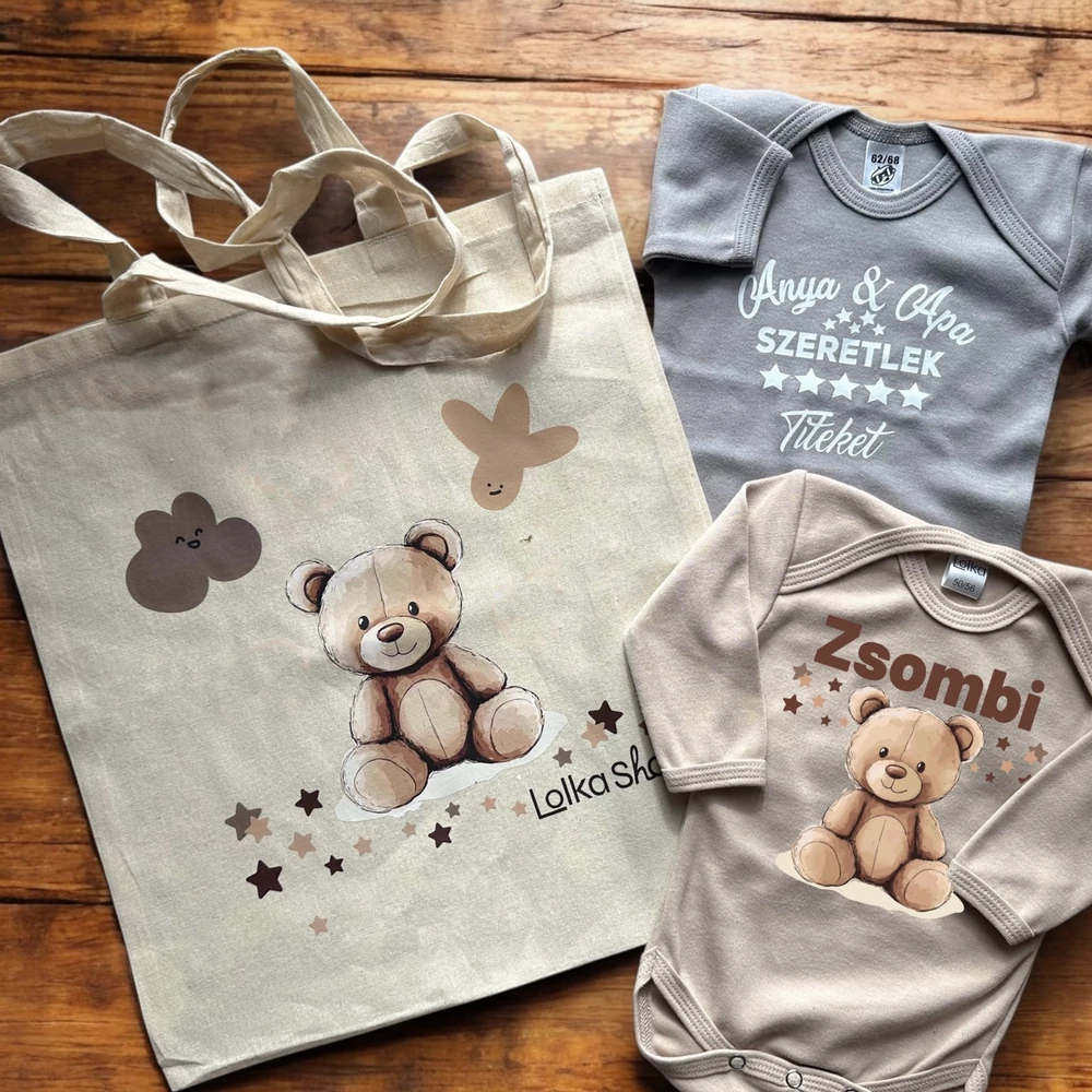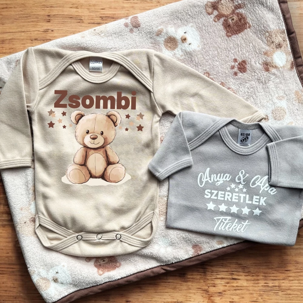 - 1 db Macis babaruha, mely személyre szabható – 100% pamutból készült babaruha, amelyen aranyos maci dizájn és a baba neve szerepel. Tökéletes ajándék kisbabák számára!