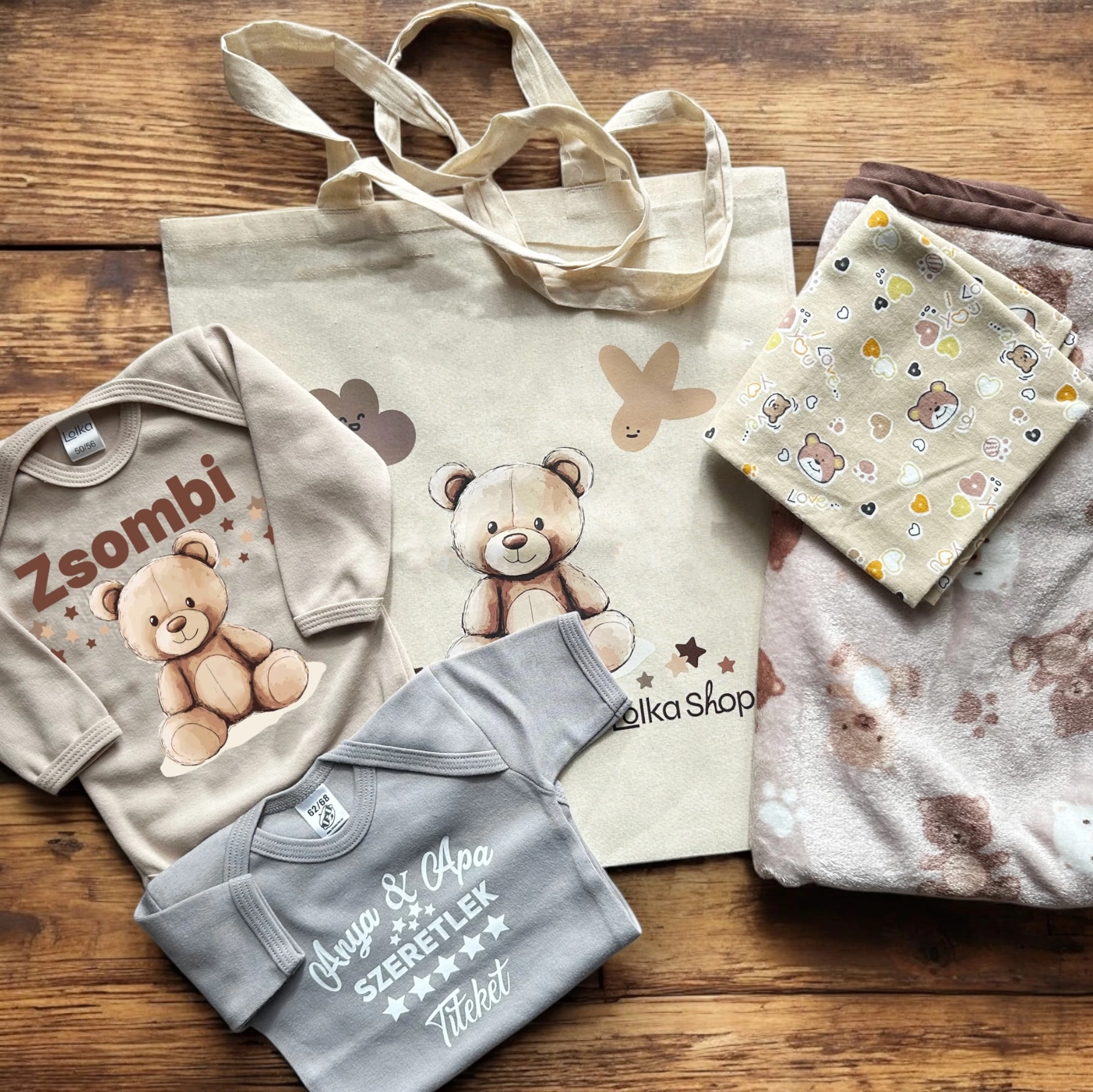 Ha éppen babát vársz, vagy már megszületett a gyermeked, esetleg babalátogatáshoz készülsz, szuper ajándék ez a natúr színekben összeállított Lolka Macis Macis Pakk.