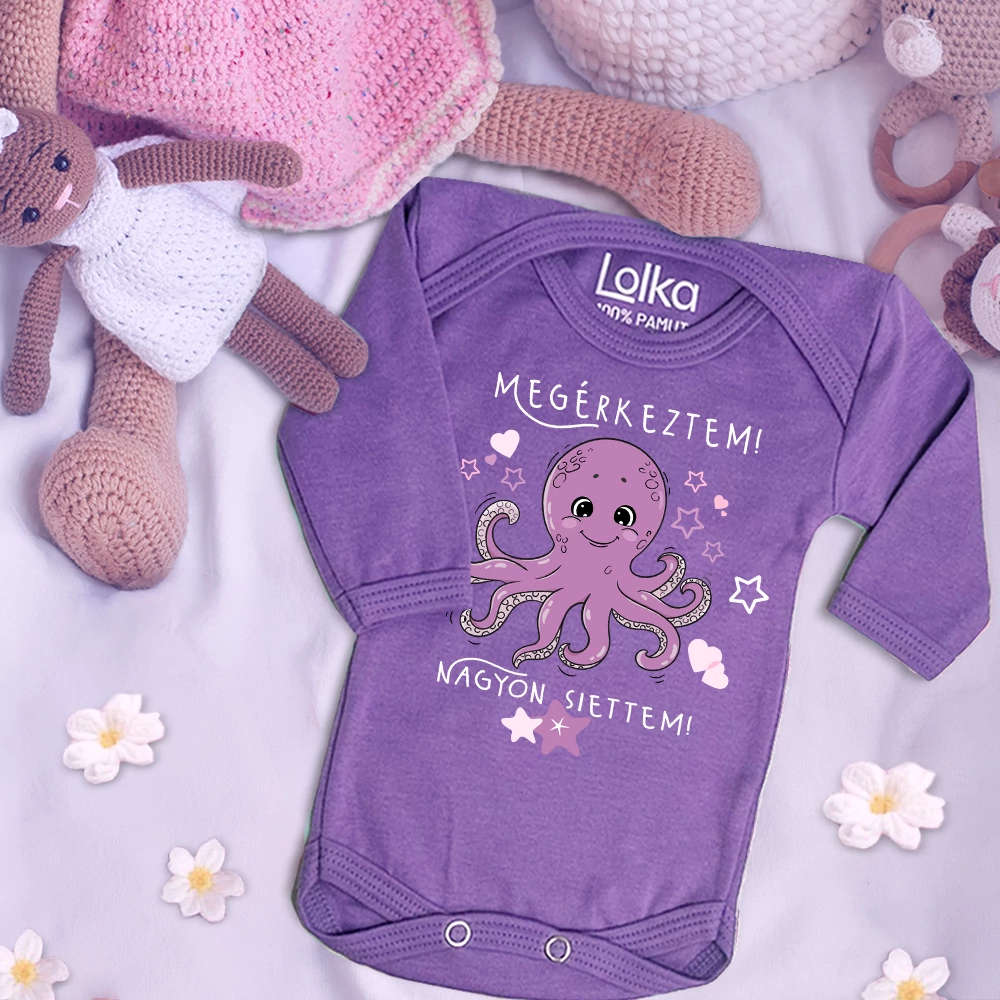 Ez a lila babaruha a legkisebb hősöknek készült, akik korábban érkeztek a világra. Ez az imádnivaló "Megérkeztem" poilipos babaruha a koraszülöttek szimbólumát, a lila polipot idézi meg. A lila polipok a koraszülöttek számára különleges jelentőséggel bírnak, mert nyugtató hatással lehetnek a babákra. A lila polipok nemcsak kedvesek, de szimbolizálják a koraszülöttekért folytatott küzdelmet és az apró csodák erejét. Ünnepeld a legkisebb hős mindennapjait ezzel a különleges babaruhával!