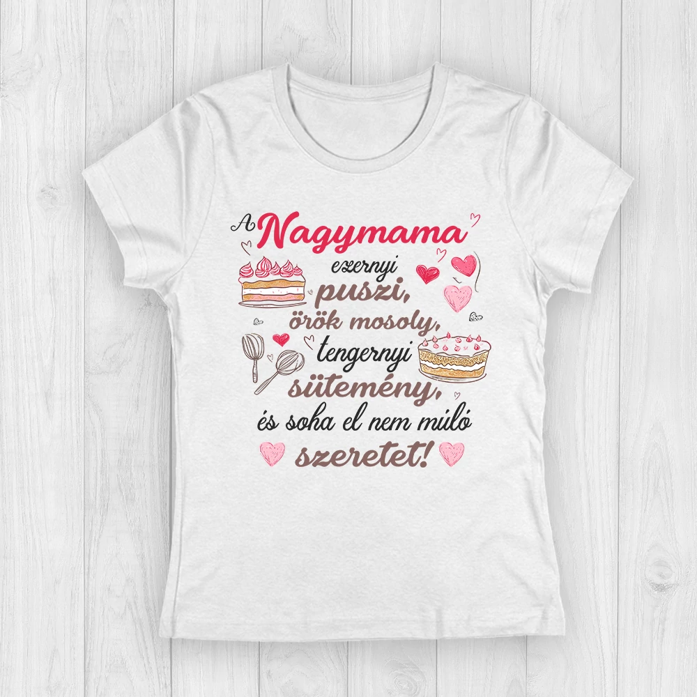 Hozd el nagymamád számára a tökéletes ajándékot, ami kifejezi mindazt, amit jelent a családnak! Ez a „A nagymama: ezernyi puszi, örök mosoly, tengernyi sütemény, és soha el nem múló szeretet” feliratú női póló szívmelengető üzenetével minden nagymama szívét megdobogtatja.