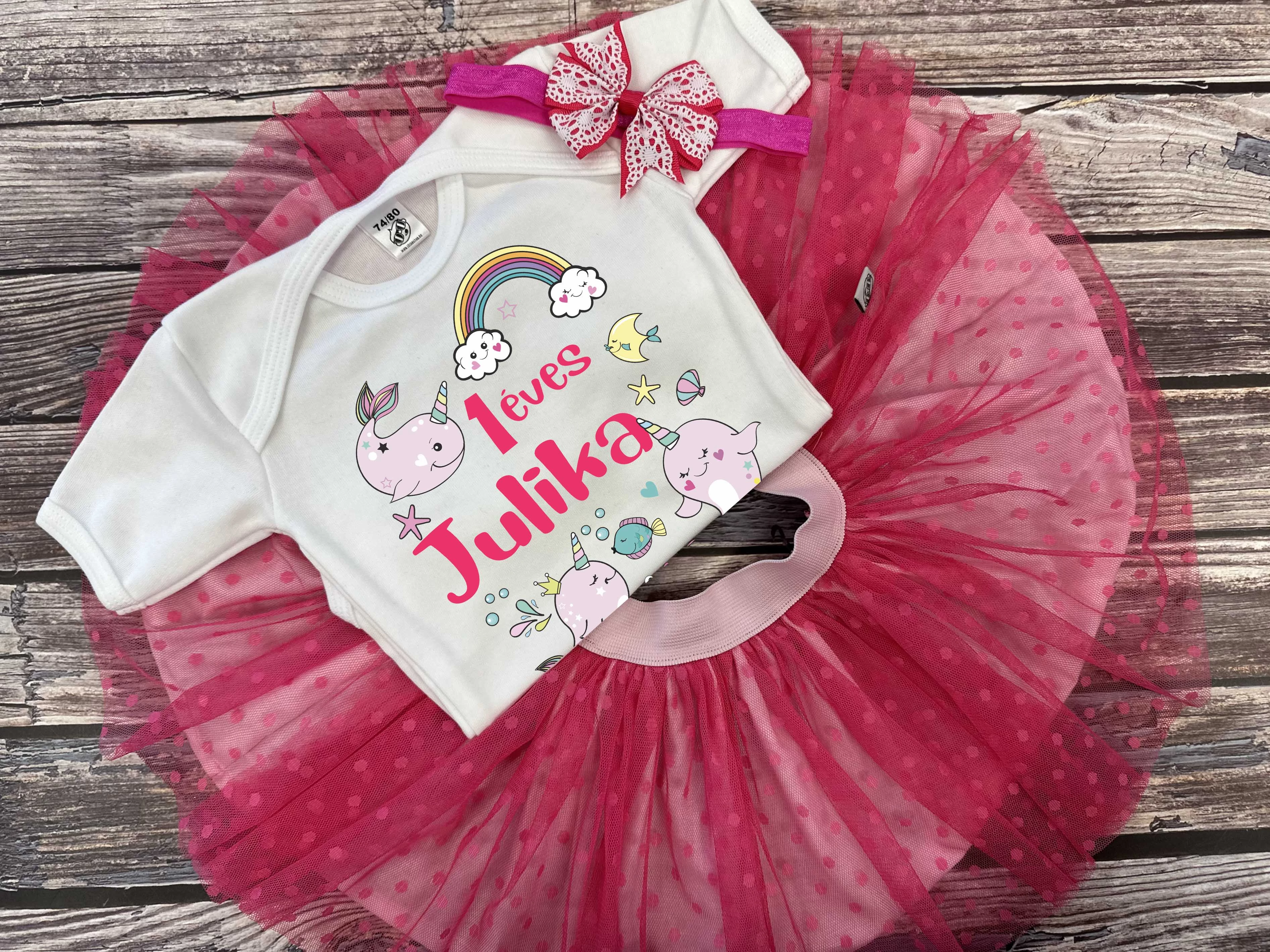 Tüllszoknya és csipkemintás hajpánt fuxia színekben és egy szülinapos babaruha szülinapozó narválokkal, egyedi névvel.