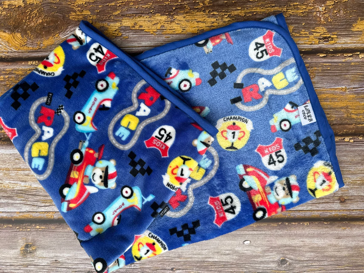 Színes, autóversenyző babapléd.