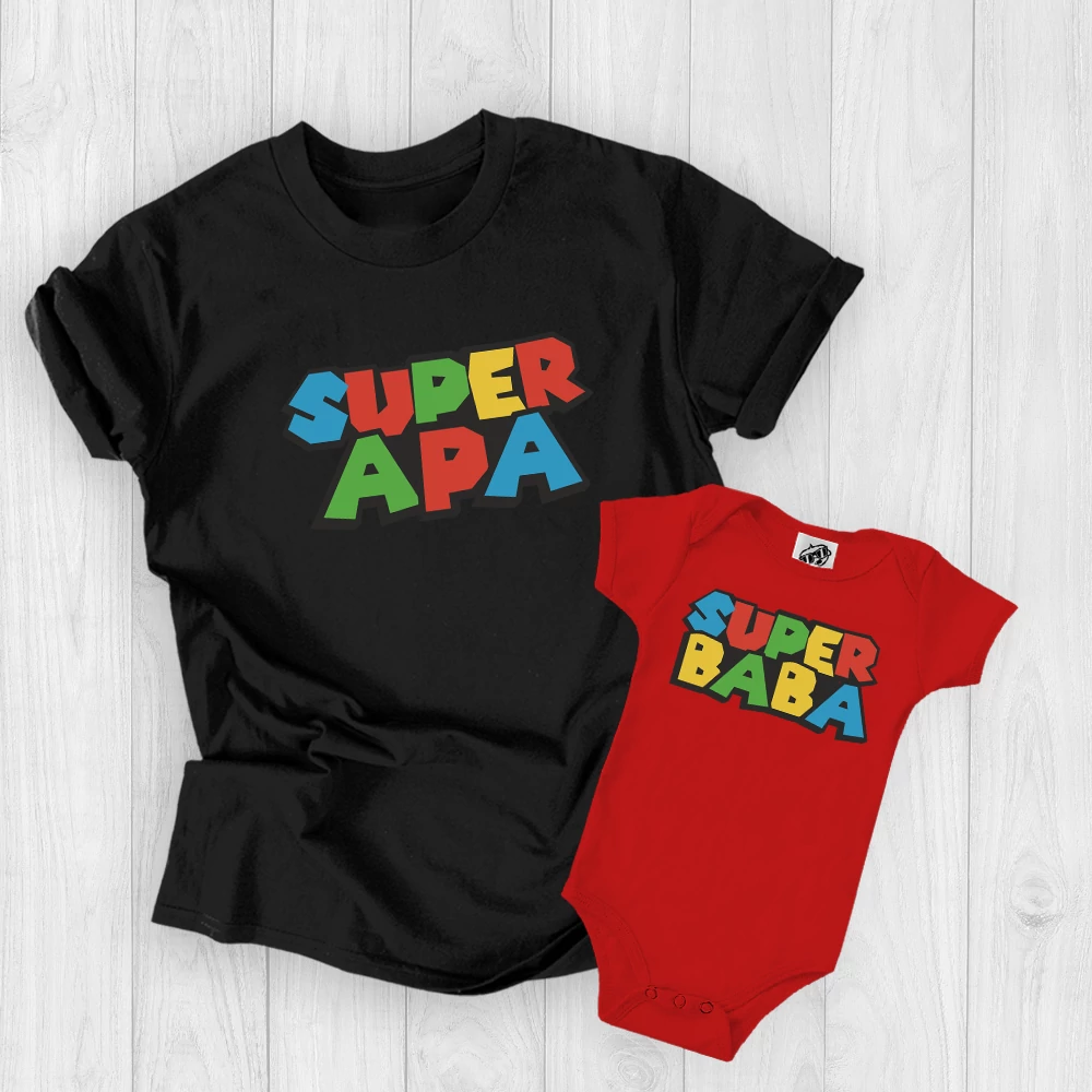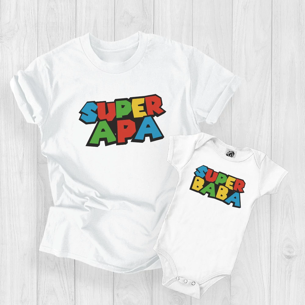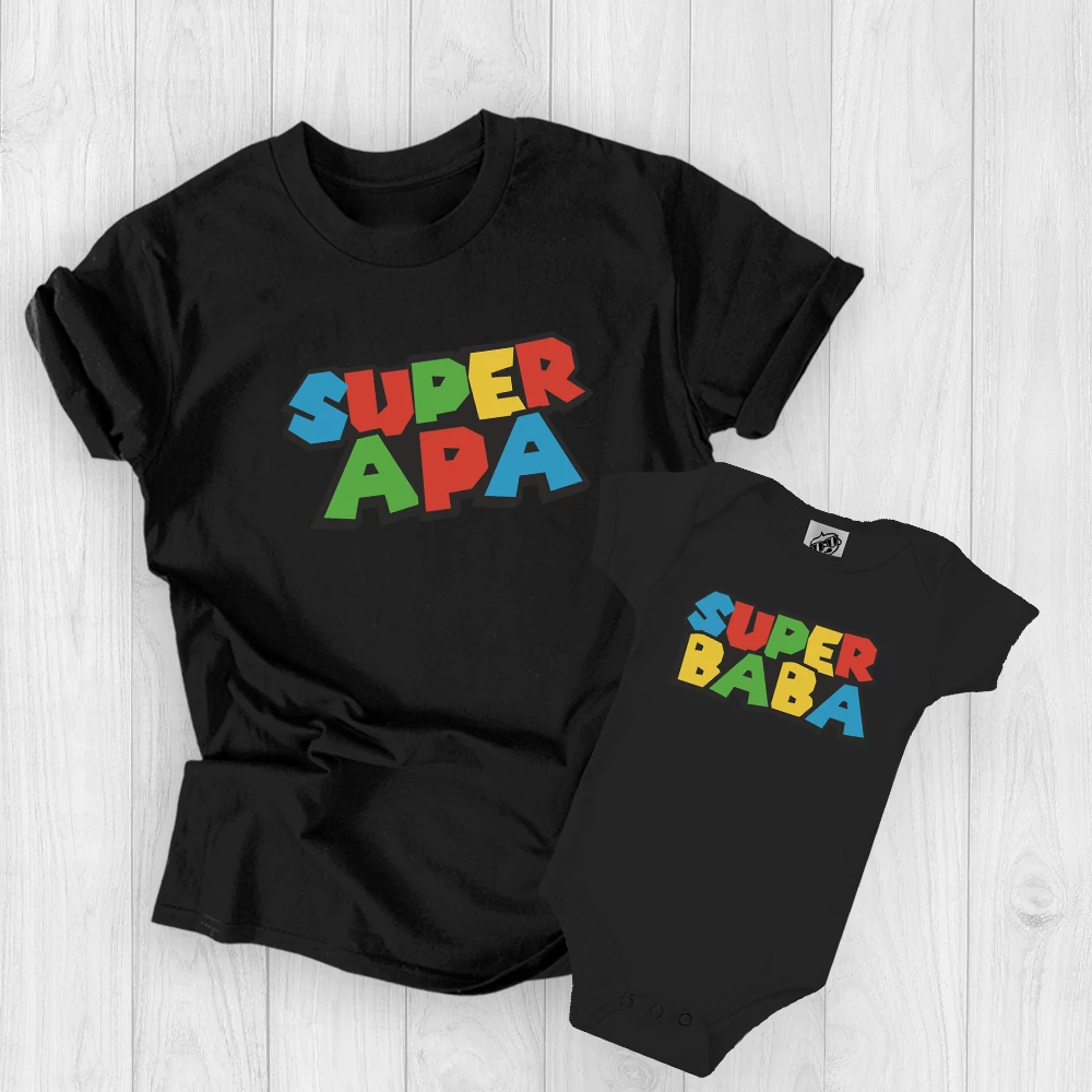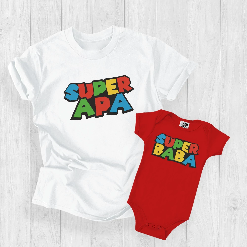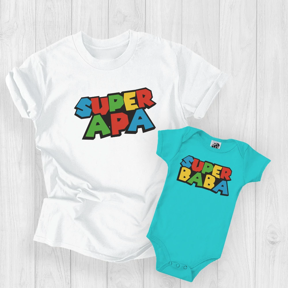 Babaruha és férfi póló, "Super Apa és Baba" egyen mintával.