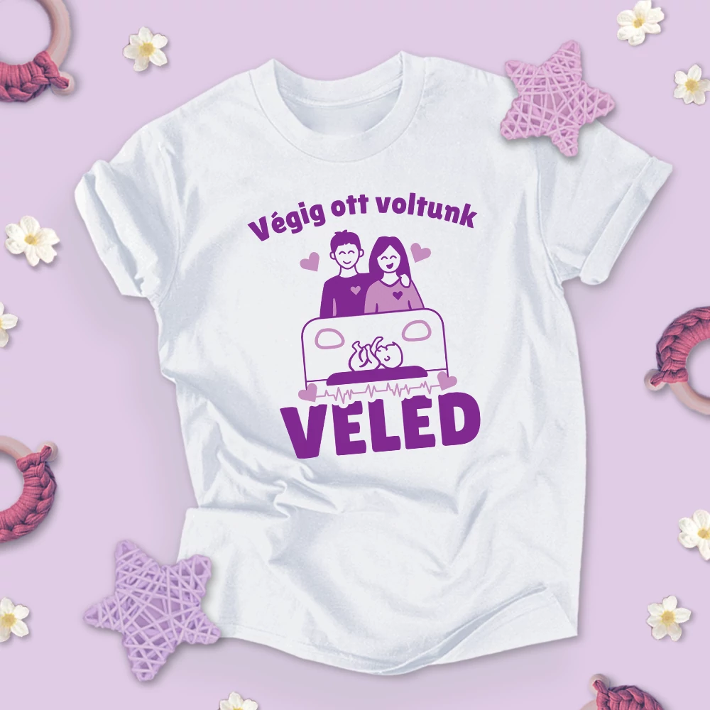 Ezen a megható férfi pólón, ahol apa öleli anyát, és a "Végig ott voltunk vele" üzenet szerepel, megjelenik az a mély szeretet és összetartás, amely a szülőket végigkísérte a koraszülött baba nehéz időszakán. Ez az ölelés és a felirat tökéletesen tükrözi azt az erőt, amellyel a szülők együtt, egymást támogatva, minden kihívást leküzdöttek, hogy minden pillanatot közösen éljenek meg.